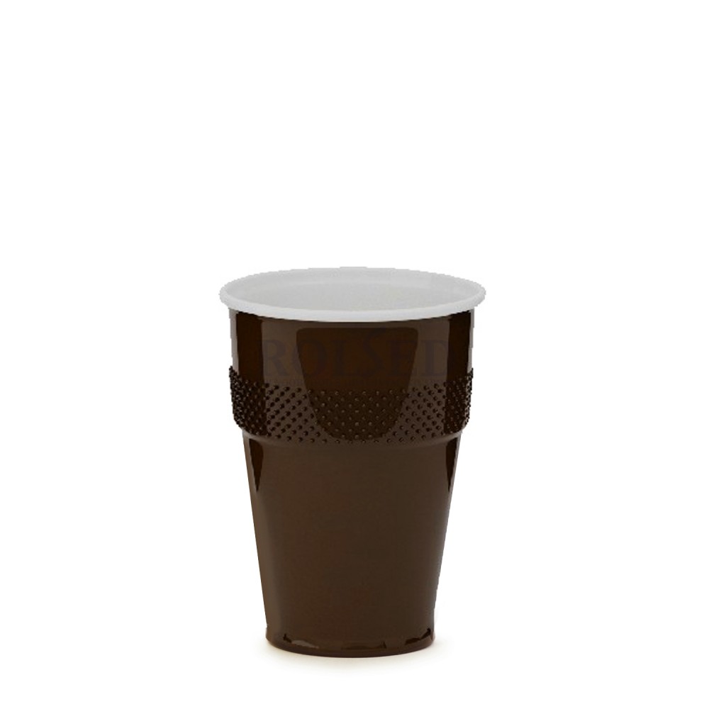 Jednorázový pohár PS v hnedo-bielej farbe. Pohár je vhodný na horúce nápoje do automatov na kávy, čaj a horúcu čokoládu.